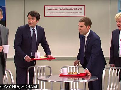Romania appears as one of the “geeks” bullied by “popular kids” Justin Trudeau and Emmanuel Macron