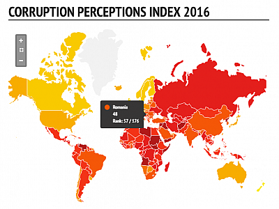Romania ranks 57th among the 176 countries surveyed in Transparency International’s 2016 Corruption