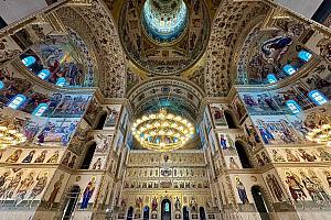 Construction of the towers and copper roofing was completed later in 2019, and the installation of the seven-ton cross atop the central dome took place in April 2025, at a height of approximately 130 meters. The interior mosaics, covering around 25,000 square meters, were completed between 2019 and 2025, forming one of the largest iconographic ensembles in the Orthodox world.