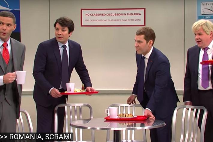 Romania appears as one of the “geeks” bullied by “popular kids” Justin Trudeau and Emmanuel Macron at the “NATO...