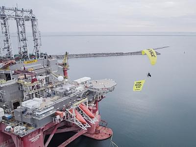 A Greenpeace activist flew a powered paraglider near the Transocean Barents platform in Constanța on